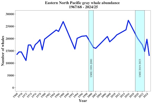 After decades of ups and downs, the population of Eastern North Pacific gray whales has been in a steep decline for the past 10 years, dropping to about 13,000 animals this year — less than half the 27,000 estimated for 2016. This is the smallest number since 1972 — the year the Marine Mammal Protection Act was adopted by Congress.