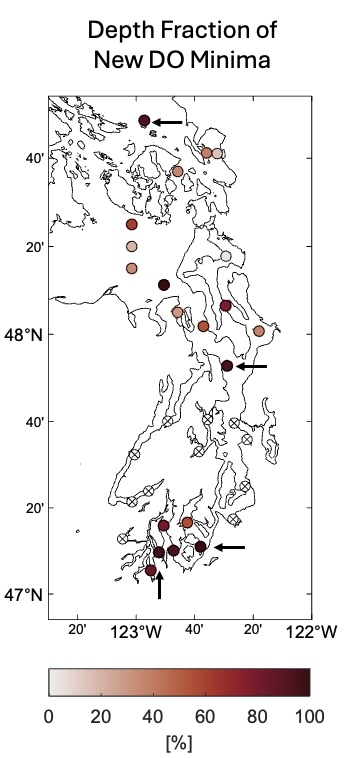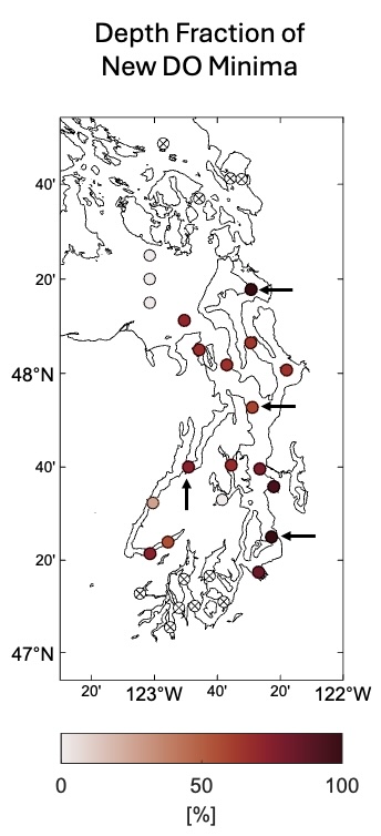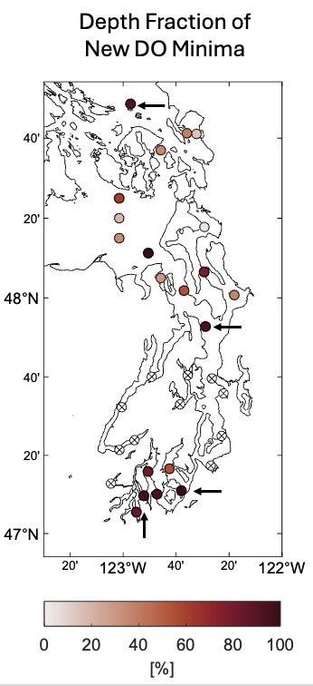 University of Washington oceanographer Jan Newton reported especially low hypoxic waters (below 2 milligrams per liter) in deep water at the south end of San Juan Island during a UW student research cruise in October.